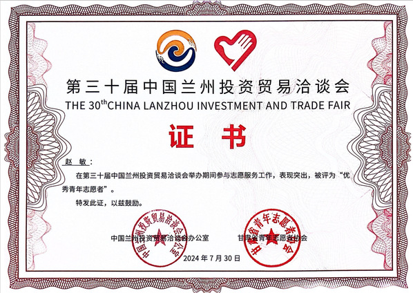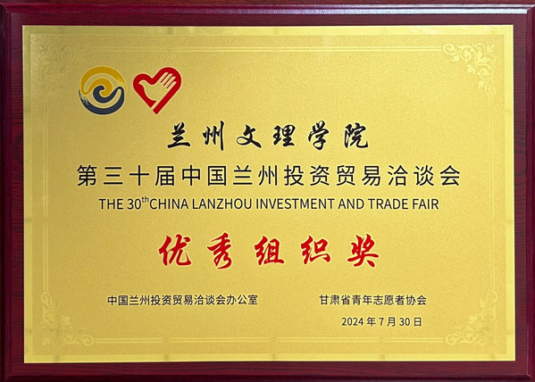 近日,中国兰州投资贸易洽谈会办公室、甘肃省青年志愿者协会授予我校第三十届中国兰州投资贸易洽谈会“优秀组织奖”荣誉称号,并授予赵敏等12名同学“优秀青年志愿者”荣誉称号。