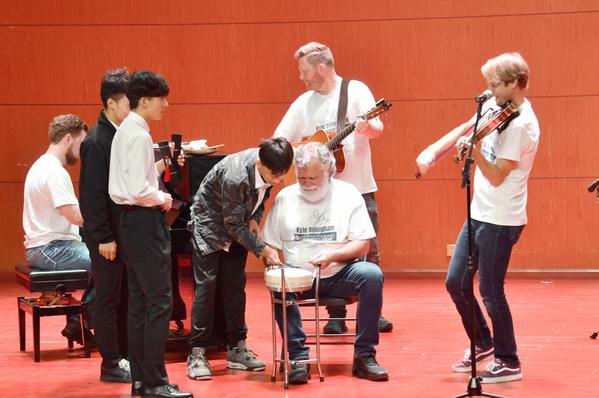 艺术交流活动上,我校师生表演了民族室内乐《敦煌新语》、琵琶中阮合奏《送我一只玫瑰花》等精彩节目,“马掌路”乐队为我校师生演奏了原创美国西部乡村音乐曲目及观众耳熟能详的中国经典乐曲,领队凯尔·迪灵汉姆还与我校教师李文浩合奏了经典二胡曲目《赛马》,乐队精湛的演出技艺和激情四射的舞台表演,赢得了现场师生热烈的掌声和喝彩。