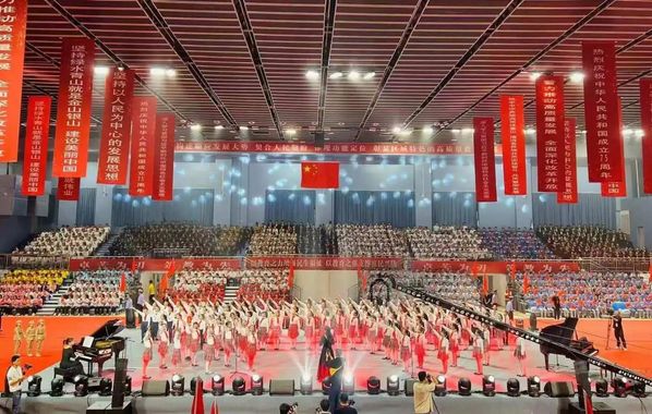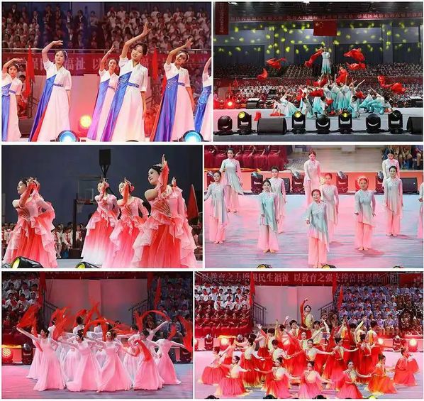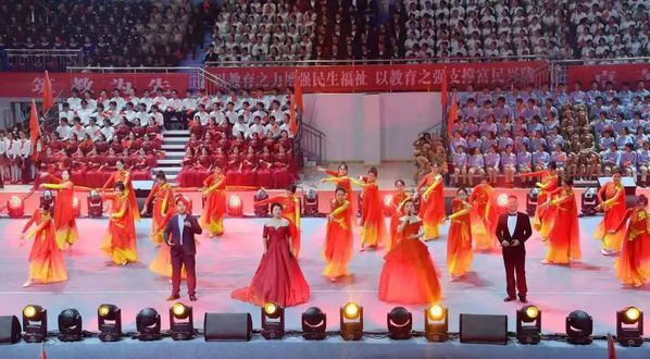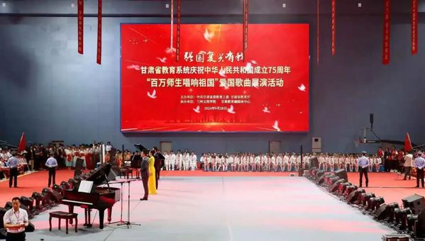 为热烈庆祝中华人民共和国成立75周年,9月28日晚,由省委教育工委、省教育厅主办,兰州文理学院、甘肃教育融媒体中心承办的“强国复兴有我”全省教育系统庆祝中华人民共和国成立75周年“百万师生唱响祖国”爱国歌曲展演活动在我校体育馆顺利举行,在兰19所高校及兰州市师生代表共计2300余人参加活动。展演活动分为《星火燎原》《峥嵘岁月》《青春礼赞》《奔向未来》四个篇章,21支展演团队用真挚的情感和激昂的歌声,表达对祖国母亲的深深祝福,祝愿伟大祖国永远繁荣昌盛。