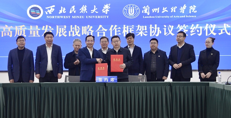 景兆玺、王顶明分别代表双方签署《西北民族大学兰州文理学院高质量发展战略合作框架协议》。在交流座谈阶段,两校相关职能部门及学院就课程建设、专业共建、硕士点申报、科研项目联报、教师互聘等方面进行了充分交流,并达成了广泛共识。