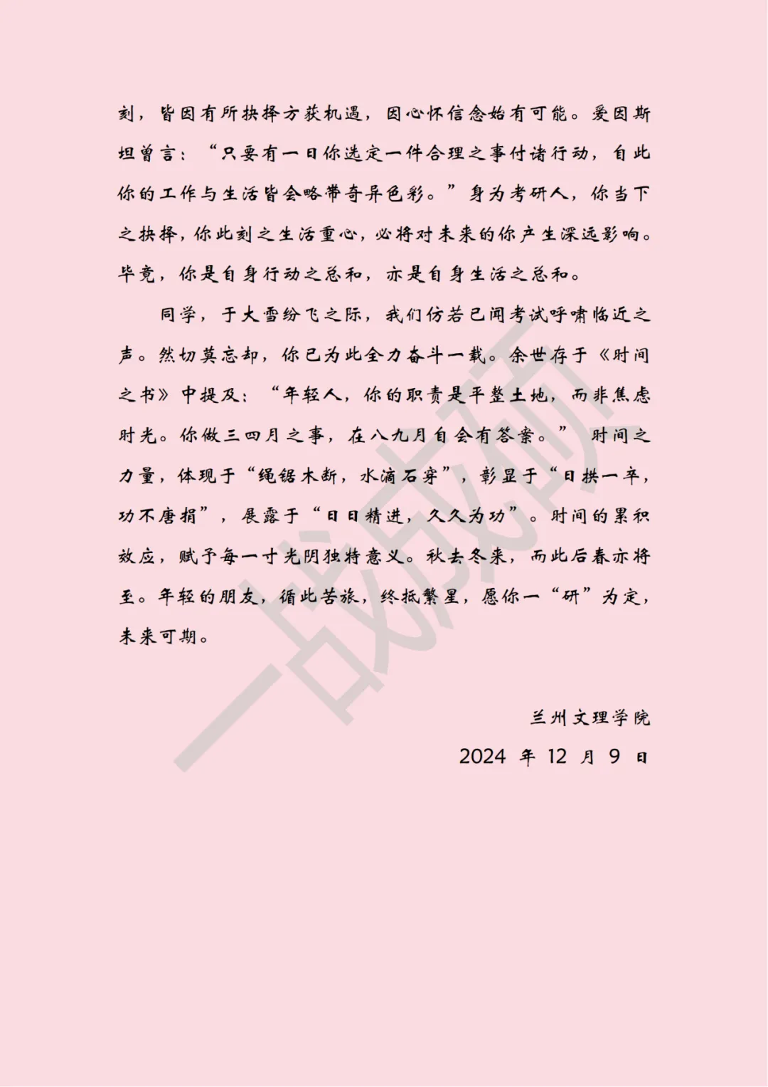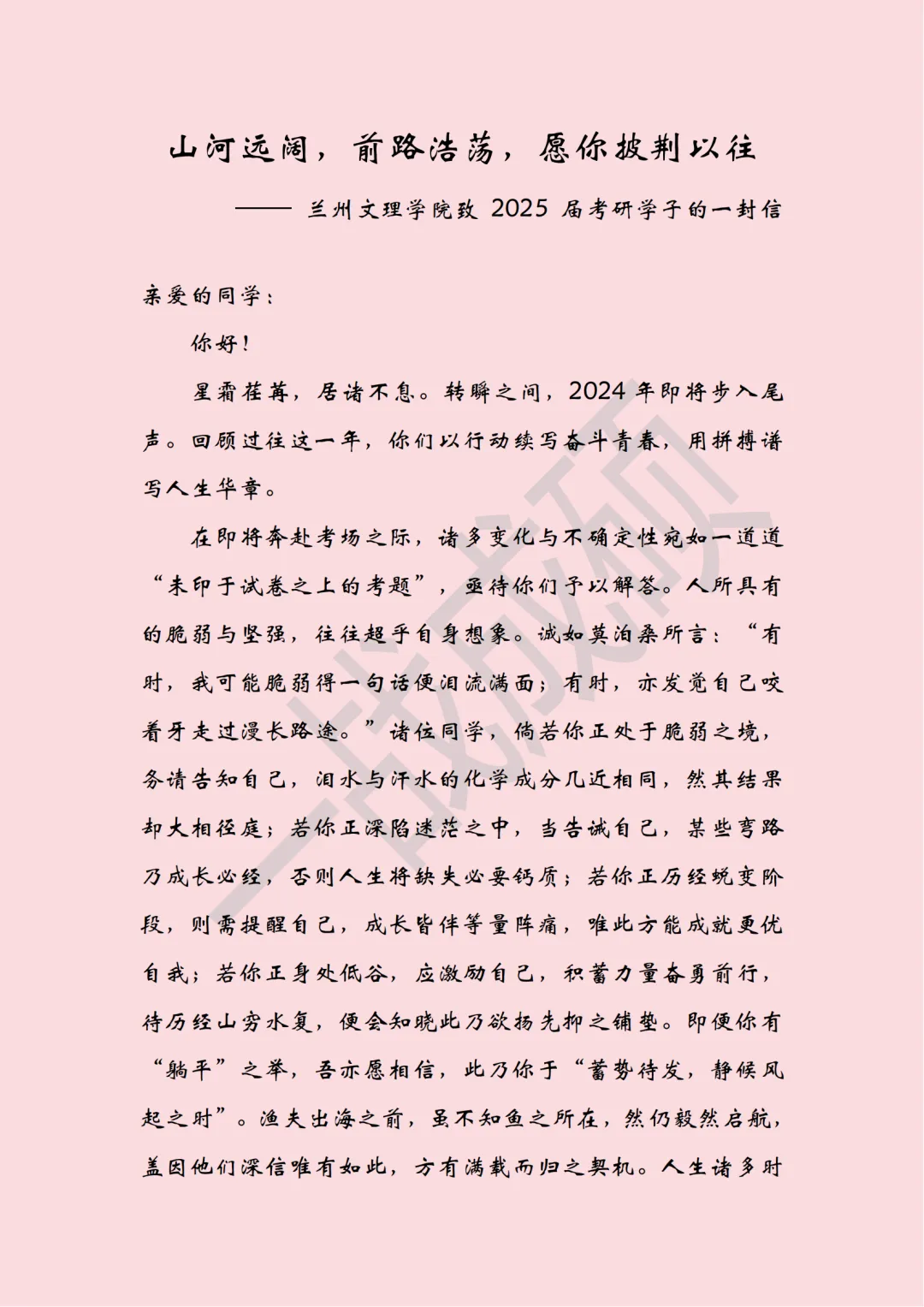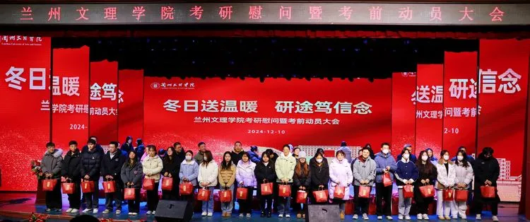 活动中,学生代表宣读了兰州文理学院致2025届考研学子的一封信,字里行间流露出对考研学子们的殷切期望与深切关怀。随后,王顶明及各二级学院院长向考研学子代表发放精心准备的考研礼包,并表示,礼包寄托了学校对考研学子们的美好祝愿与坚定支持,希望同学们在剩余的备考时间里,能够保持积极乐观的心态,坚定信念,全力以赴,争取在即将到来的考研中取得优异成绩。