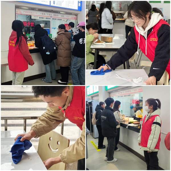 中午11:30,身着红马甲的自管会成员准时进入学生食堂,分为清洁组与引导组开展服务,及时清理餐盘、擦拭桌面,通过手势指引与温馨提示维持排队秩序。