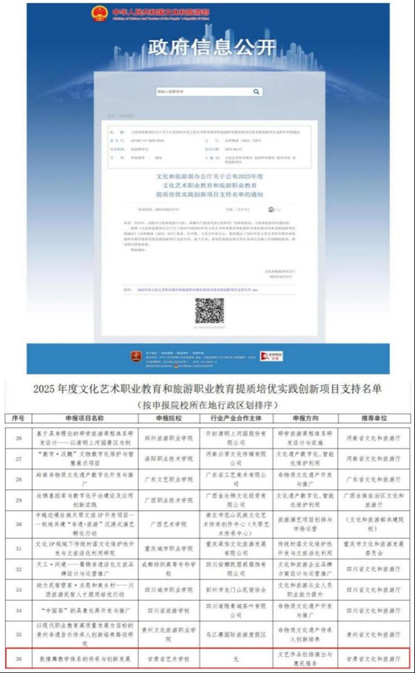 近日,文化和旅游部公布了2025年度文化艺术职业教育和旅游职业教育提质培优实践创新项目评审结果。本次评选共收到全国申报项目100余项,经专家严格评审和公示,最终确定40个入选项目。我校艺术职业学院(甘肃省艺术学校)金亮老师申报的《敦煌舞教学体系的传承与创新发展》项目成功入选。