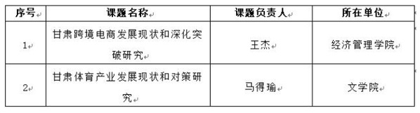 近日,甘肃省人民政府决策咨询委员会正式公布了2025年26个研究课题公开招标结果。我校经济管理学院王杰博士团队申报的《甘肃跨境电商发展现状和深化突破研究》和文学院马得瑜副教授团队申报的《甘肃体育产业发展现状和对策研究》成功中标。
