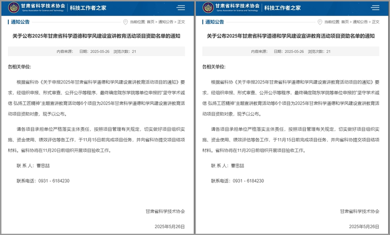 5月26日,甘肃省科学技术协会公布了2025年科学道德和学风建设宣讲教育活动项目及“科技筑梦”大学生科技志愿服务项目资助名单。由科研处牵头、校团委配合申报的《多维浸润·协同育人——兰州文理学院科学道德与学风建设宣讲教育创新实践项目》《雁青科技志愿服务队——“生态甘肃,青春护航”科技志愿宣讲》均获批立项,资助经费共计7万元。这是我校科学技术协会成立以来,在科学道德教育与科技志愿服务两大领域首次同步获得专项资助,充分展现了我校在科研育人、服务社会方面所取得的全新且显著的成果,为学校进一步深化学风建设与人才培养筑牢了坚实基础,搭建了崭新平台。