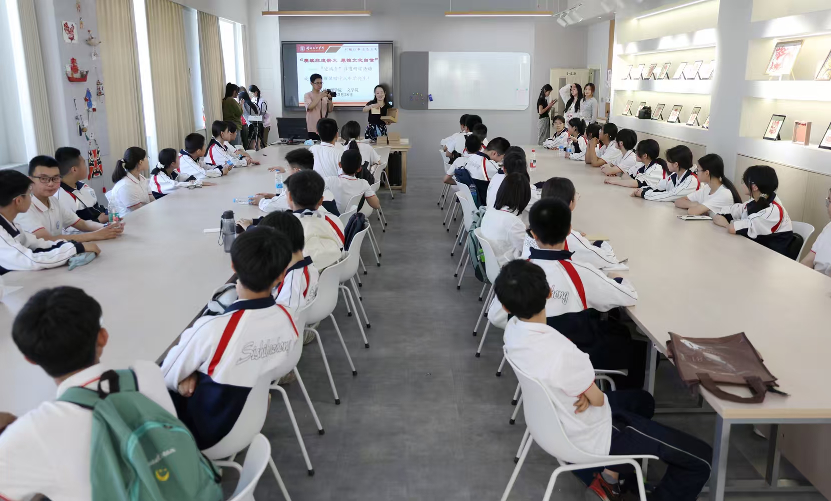 为深入贯彻习近平总书记关于传承中华优秀传统文化的重要论述,推进大中小学思政课一体化建设走深走实,5月28日下午,文学院与兰州市第四十八中学联合开展了以“赓续非遗薪火 厚植文化自信”为主题的端午节“大思政”研学活动。此次活动将非遗传承与思政教育深度融合,带领师生沉浸式感受端午文化的魅力。这场融合艺术审美与文化传承的思政大课,让端午文化润泽师生心灵,引导教育师生厚植家国情怀、弘扬民族精神。