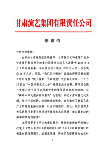 近日,甘肃演艺集团有限责任公司向我校发来感谢信,高度赞扬音乐舞蹈学院在第六届黄河之滨文艺展演及“我们的中国梦”省级政府购买精品剧目市州巡演“陇上神泉 书画通渭”文化惠民活动中推出的《梵乐音声》《唐韵胡旋》《四飞天》《丝路鼓韵》四部原创敦煌舞剧目。集团充分肯定了我校师生以精湛表演展现敦煌文化深厚底蕴和时代活力的优异表现,并期待与我校继续深化合作,共同服务全省文化繁荣发展。