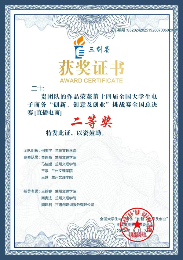 将创新创业教育贯穿人才培养全过程。开设《创新创业训练基础》《创业学》等课程,引导学生立足西部丰富的文旅资源禀赋(如敦煌文化、黄河风情、民族特色、非遗项目等),运用经济管理知识和数字化工具,探索文旅新业态、新模式、新产品的开发与运营。培养学生敏锐的市场洞察力、资源整合力和创业实践力,鼓励毕业生成为能扎根西部、利用特色资源进行有效创新或成功创业的开拓者。自2024年学院“二十”团队首次荣获电子商务“创新、创意及创业”大赛全国二等奖后,2025年又有两支队伍成功入围国赛。