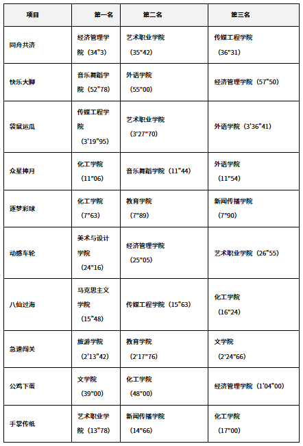 比赛现场气氛活跃,各学院代表队精神饱满,参赛选手们在赛场上团结协作、奋勇争先。同舟共济项目中,队员们步调一致、配合默契;快乐大脚比赛中,选手们动作协调、你追我赶;袋鼠运瓜环节更是妙趣横生,展现了学子们的灵活身手。整个赛场洋溢着青春的活力与欢笑,充分展现了我校学子积极向上的精神风貌和良好的团队意识。经过激烈角逐,各单项前三名成绩如下: